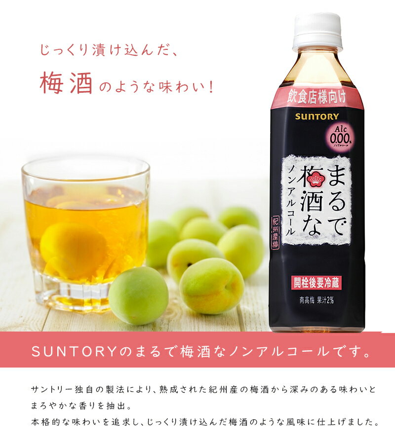商品名SUNTORY まるで梅酒なノンアルコール 500ml名称ノンアルコール飲料内容量500ml ×1本原材料名果糖ぶどう糖液糖、梅果汁(南高梅)、梅エキス(梅、砂糖)、梅酢、酸味料、香料、カラメル色素アルコール度0%保存方法直射日光・高温多湿を避けて保存してください。