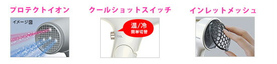 ) 静電気を制御して、髪の広がりや痛みを抑えるプロテクトイオンと、乾燥を抑えるマイナスイオンの2つのモードがスイッチ1つで切替可能!速乾なのにまとまるツヤ髪へと導きます。