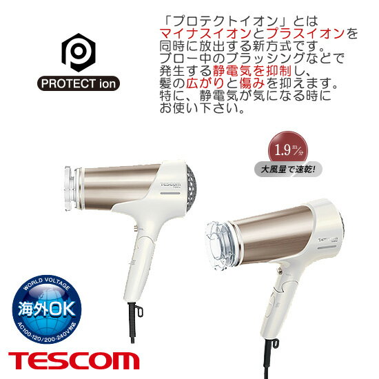 テスコム プロテクトイオンヘアードライヤー TID81J プロテクトイオンで静電気制御&マイナスイオンで艶髪 50年にわたり日本の美容室向けにドライヤーを開発し、高い信頼を獲得してきた実績と品質で、優れた使いやすさを提供する日本製シリーズ。